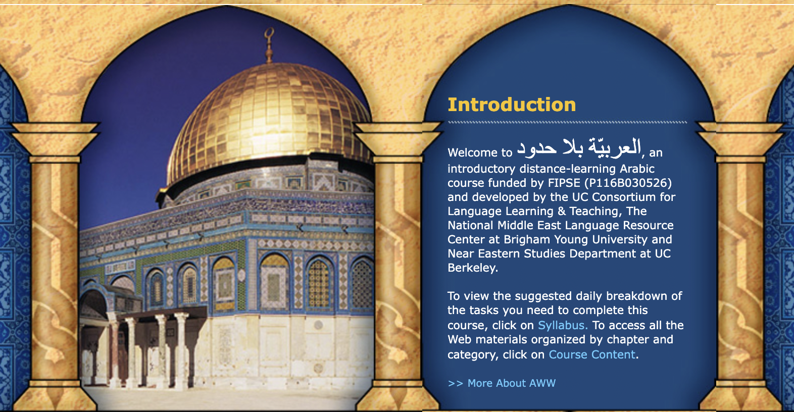 Welcome to العربيّة بلا حدود, an introductory distance-learning Arabic course funded by FIPSE (P116B030526) and developed by the UC Consortium for Language Learning & Teaching, The National Middle East Language Resource Center at Brigham Young University and Near Eastern Studies Department …